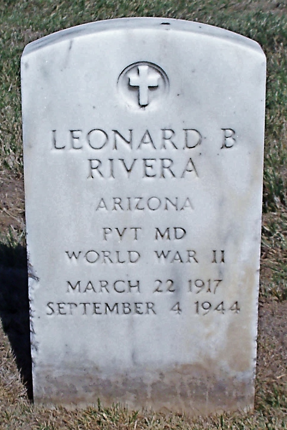 Leonard B. Rivera was born on March 22, 1917. He served in the U.S. Army during World War II as a Private in the US Army. He entered service in Arizona. He died on September 4, 1944, was initially buried at Villeneuve-sur-Auvers in France and is now buried at Golden Gate National Cemetery, San Bruno, San Mateo County, California, USA.