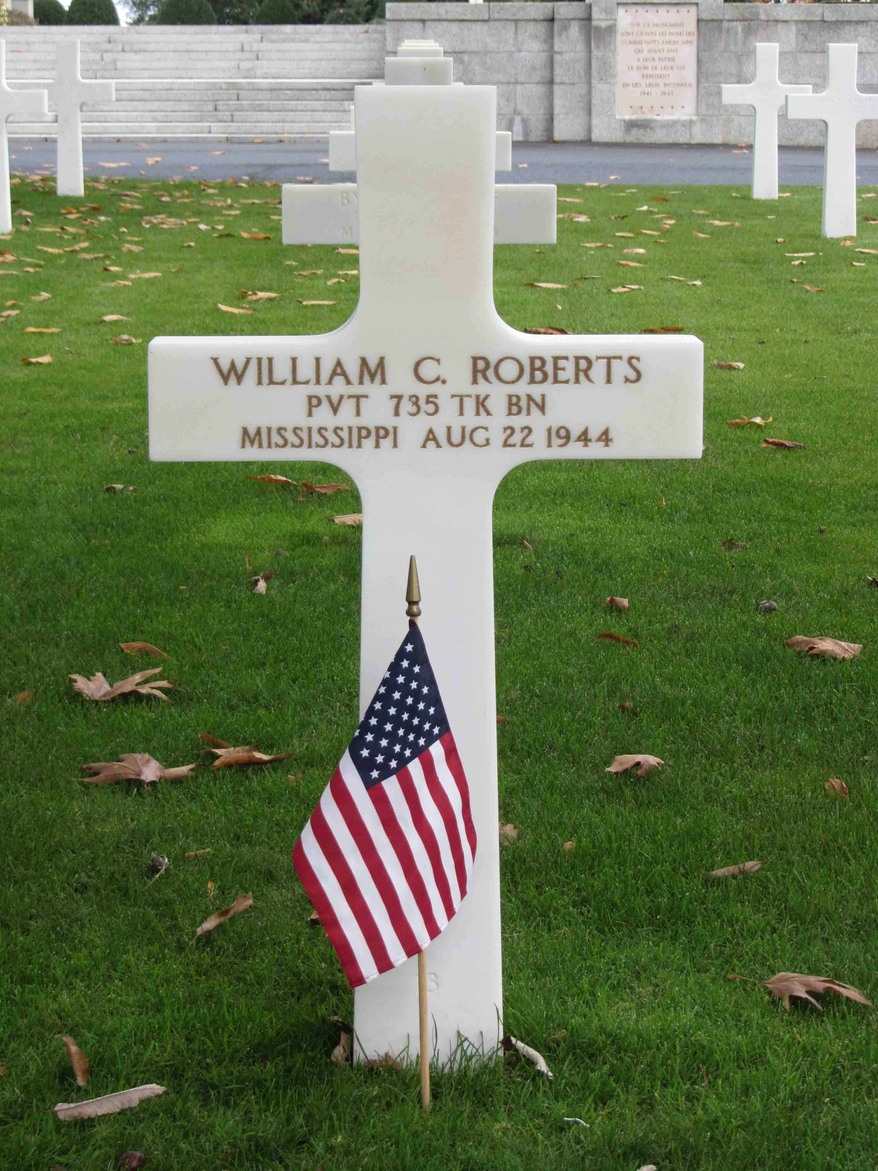 William Clyde “Dub” Roberts was born on November 2, 1918. He served in the U.S. Army during World War II as a Private in the 735th Tank Battalion. He entered service in Mississippi. He died on August 22, 1944, was initially buried at Villeneuve-sur-Auvers in France and is now buried at Brittany American Cemetery, St. James, France.