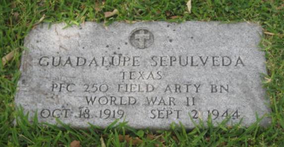 Guadalupe Sepulveda was born on October 18, 1919. He served in the U.S. Army during World War II as a Private First Class in the 250th Field Artillery Battalion. He entered service in Texas. He died on September 2, 1944, was initially buried at Villeneuve-sur-Auvers in France and is now buried at Forest Park Cemetery, Houston, Harris County, Texas, USA.