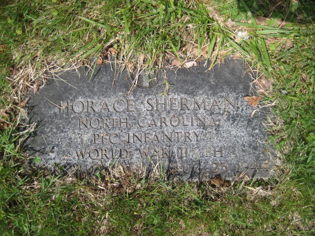 Horace Sherman was born on March 12, 1909. He served in the U.S. Army during World War II as a Private First Class in the 38th Armored Infantry Battalion, 7th Armored Division. He entered service in North Carolina. He died on August 23, 1944, was initially buried at Villeneuve-sur-Auvers in France and is now buried at Oakdale Cemetery, Hendersonville, Henderson County, North Carolina, USA.