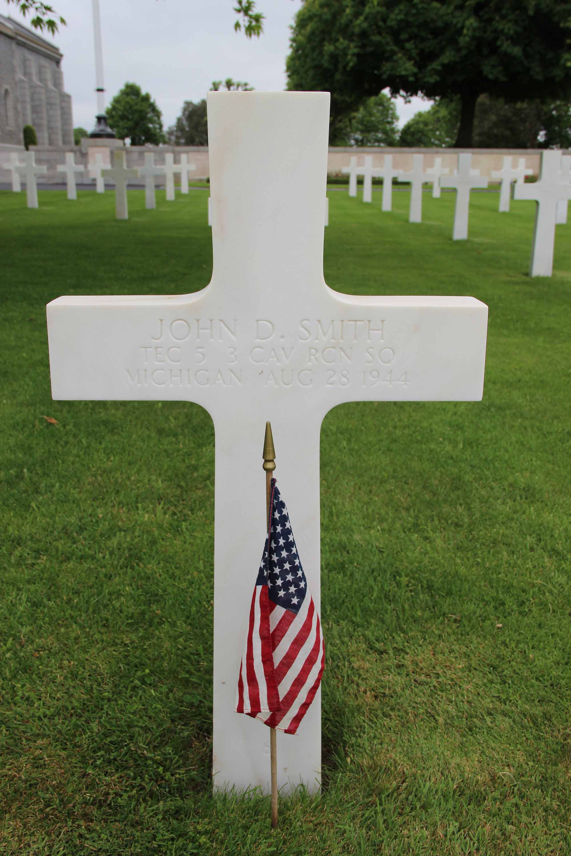 John D. Smith served in the U.S. Army during World War II as a Technician Fifth Grade in the 3rd Cavalry Reconnaissance Squadron. He entered service in Michigan. He died on August 28, 1944, was initially buried at Villeneuve-sur-Auvers in France and is now buried at Brittany American Cemetery, St. James, France.