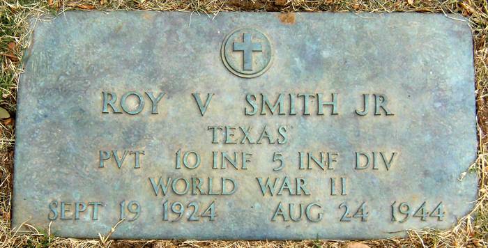 Roy V Smith, Jr. was born on September 19, 1924. He served in the U.S. Army during World War II as a Private in the 10th Infantry Regiment, 5th Infantry Division. He entered service in Texas. He died on August 24, 1944, was initially buried at Villeneuve-sur-Auvers in France and is now buried at Calvary Hill Cemetery and Mausoleum, Dallas, Dallas County, Texas, USA.