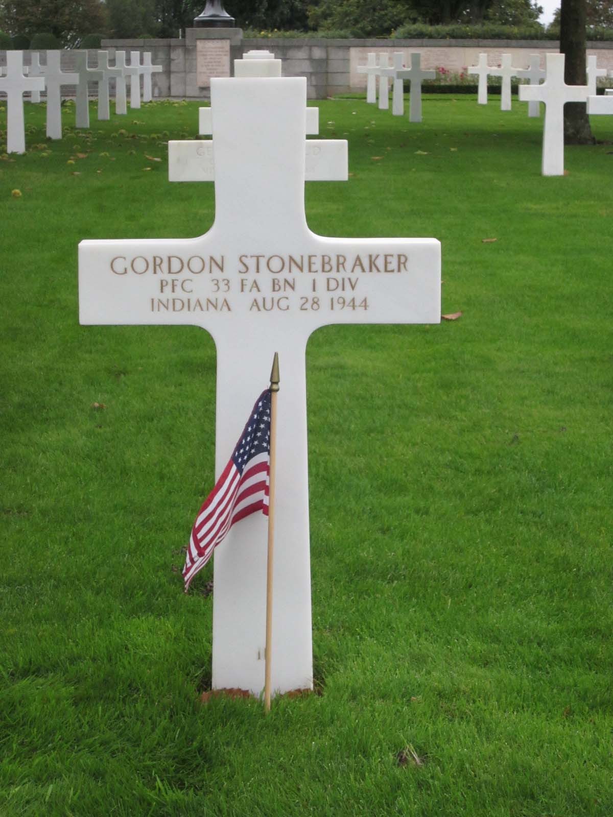 When Gordon Stonebraker was born on December 15, 1918, in Veedersburg, Indiana, his father, Ora, was 22 and his mother, Edith, was 20. He had one brother and four sisters. served in the U.S. Army during World War II as a Private First Class in the 33rd Field Artillery Batalion, 1st Infantry Division. He entered service in Indiana. He died on August 28, 1944, was initially buried at Villeneuve-sur-Auvers in France and is now buried at Brittany American Cemetery, St. James, France.