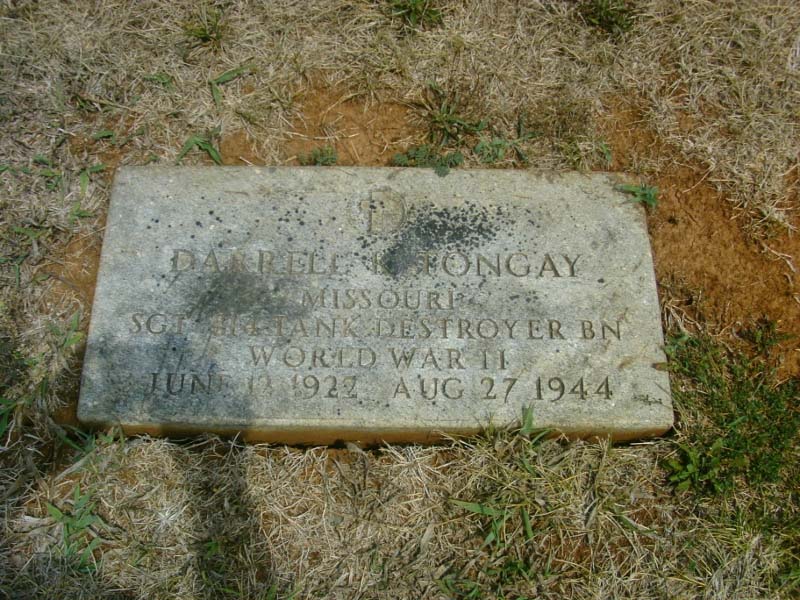 Darrell Keith Tongay was born on June 13, 1922. He served in the U.S. Army during World War II as a Sergeant in the 814th Tank Destroyer Battalion, 7th Armored Division. He entered service in Missouri. He died on August 27, 1944, was initially buried at Villeneuve-sur-Auvers in France and is now buried at Saint Francois Memorial Park, Bonne Terre, St. Francois County, Missouri, USA.