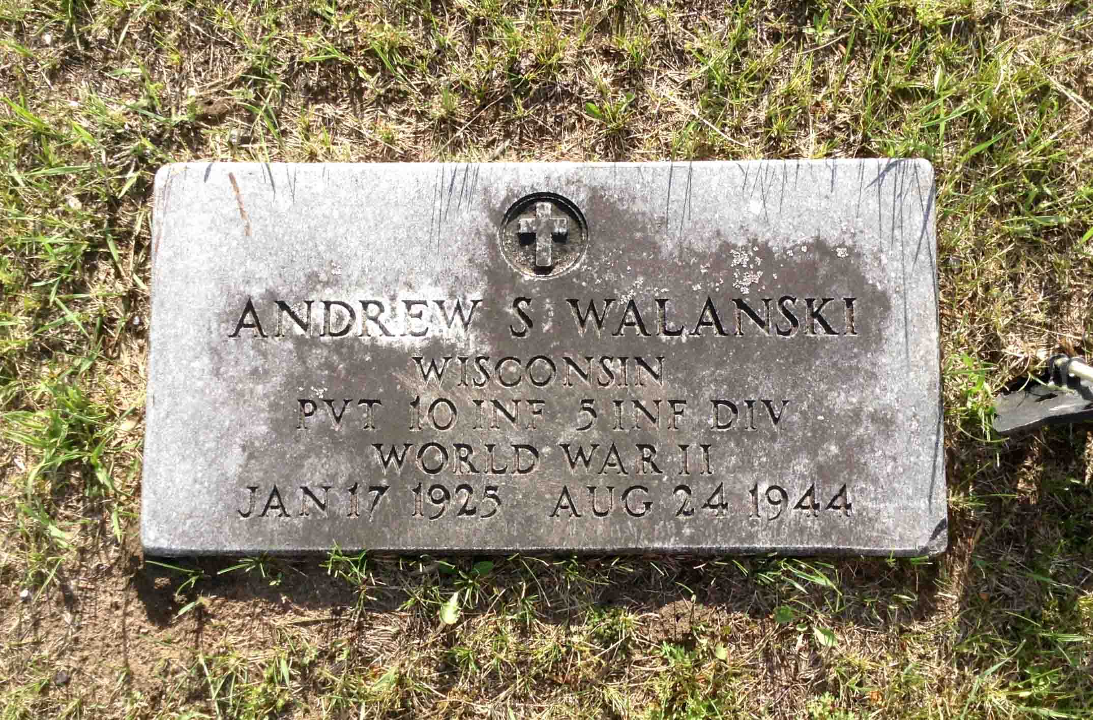 Andrew S. Walanski was born on January 17, 1925. He served in the U.S. Army during World War II as a Private in the 10th Infantry Regiment, 5th Infantry Division. He entered service in Wisconsin. He died on August 24, 1944, was initially buried at Villeneuve-sur-Auvers in France and is now buried at Saint Francis of Assisi Catholic Cemetery, Necedah, Juneau County, Wisconsin, USA.
