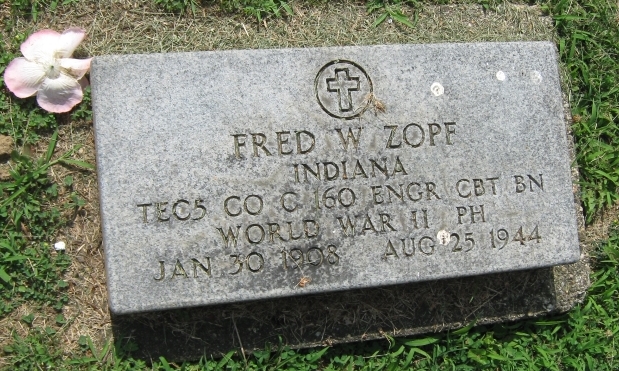 Fred W. Zopf was born on January 30, 1908. he served in the U.S. Army during World War II as a Technician Fifth Grade in the 160th Engineer Combat Battalion. He entered service in Indiana. He died on August 25, 1944, was initially buried at Villeneuve-sur-Auvers in France and is now buried at Highland Lawn Cemetery, Terre Haute, Vigo County, Indiana, USA.