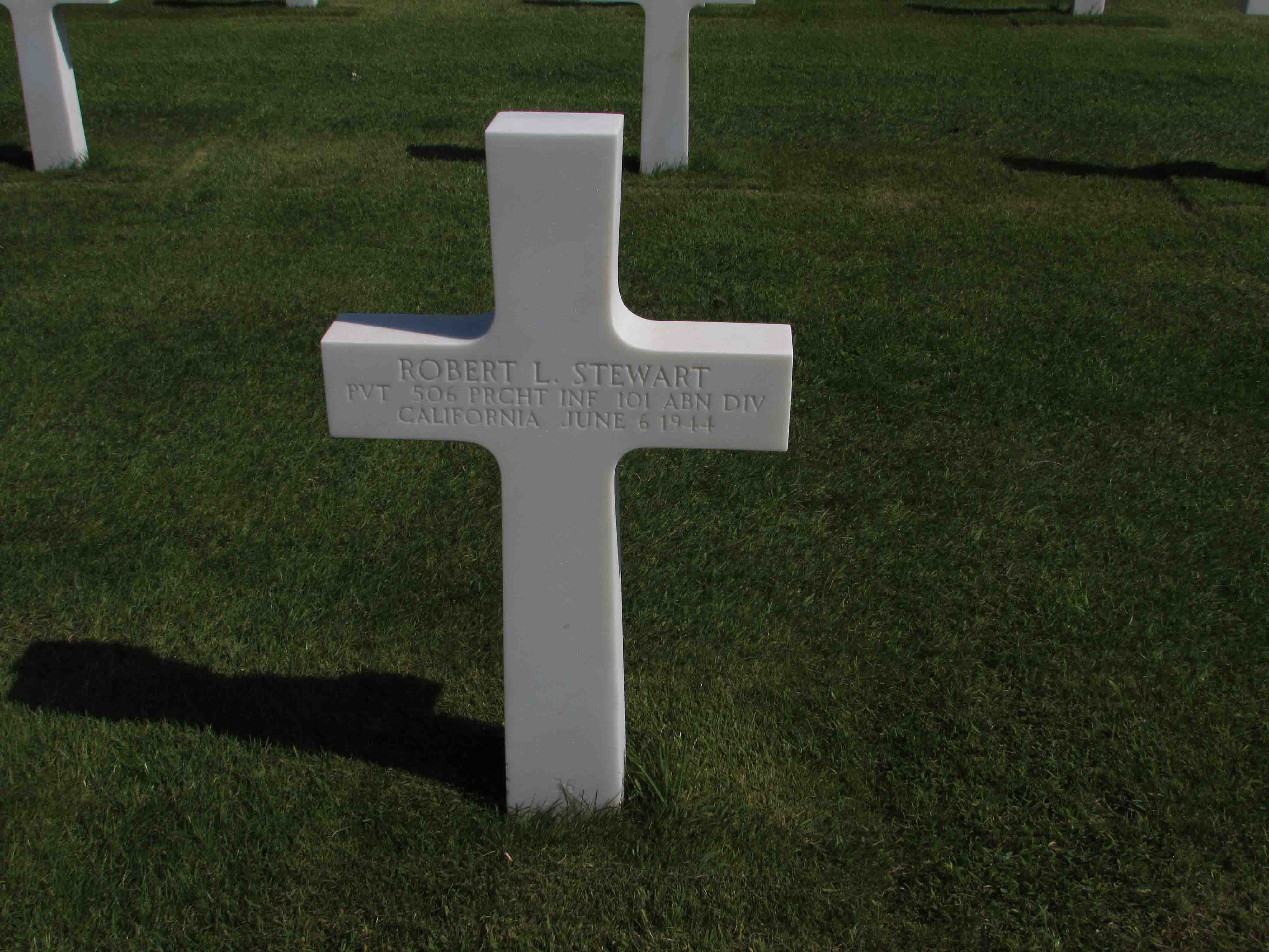 Robert L. Stewart was born on November 11, 1920. He entered the military service in California. He served in the U.S. Army during the Normandy Invasion of World War II as a Private in A Company, 506th Parachute Infantry Regiment, 101st Airborne Division. He died on June 6, 1944 and is now buried in Normandy American Cemetery, Colleville-sur-Mer, France.
