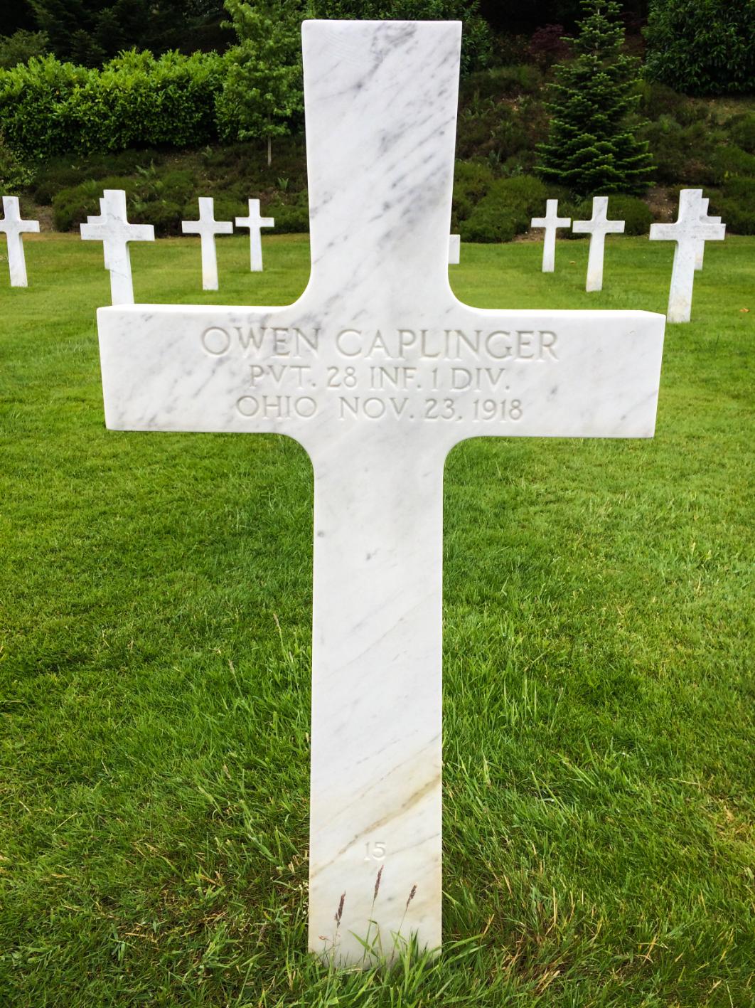 When Owen Caplinger was born on June 27, 1894, his father, Charles, was 36 and his mother, Etta, was 29. He had four brothers and six sisters. He served in he U.S. Army during the World War I as a Private in I Company, 28th Infantry Regiment, 1st Infantry Division. He died on November 23, 1918 and is now buried in Aisne-Marne American Cemetery and Memorial, Belleau, Departement de l'Aisne, Picardie, France.