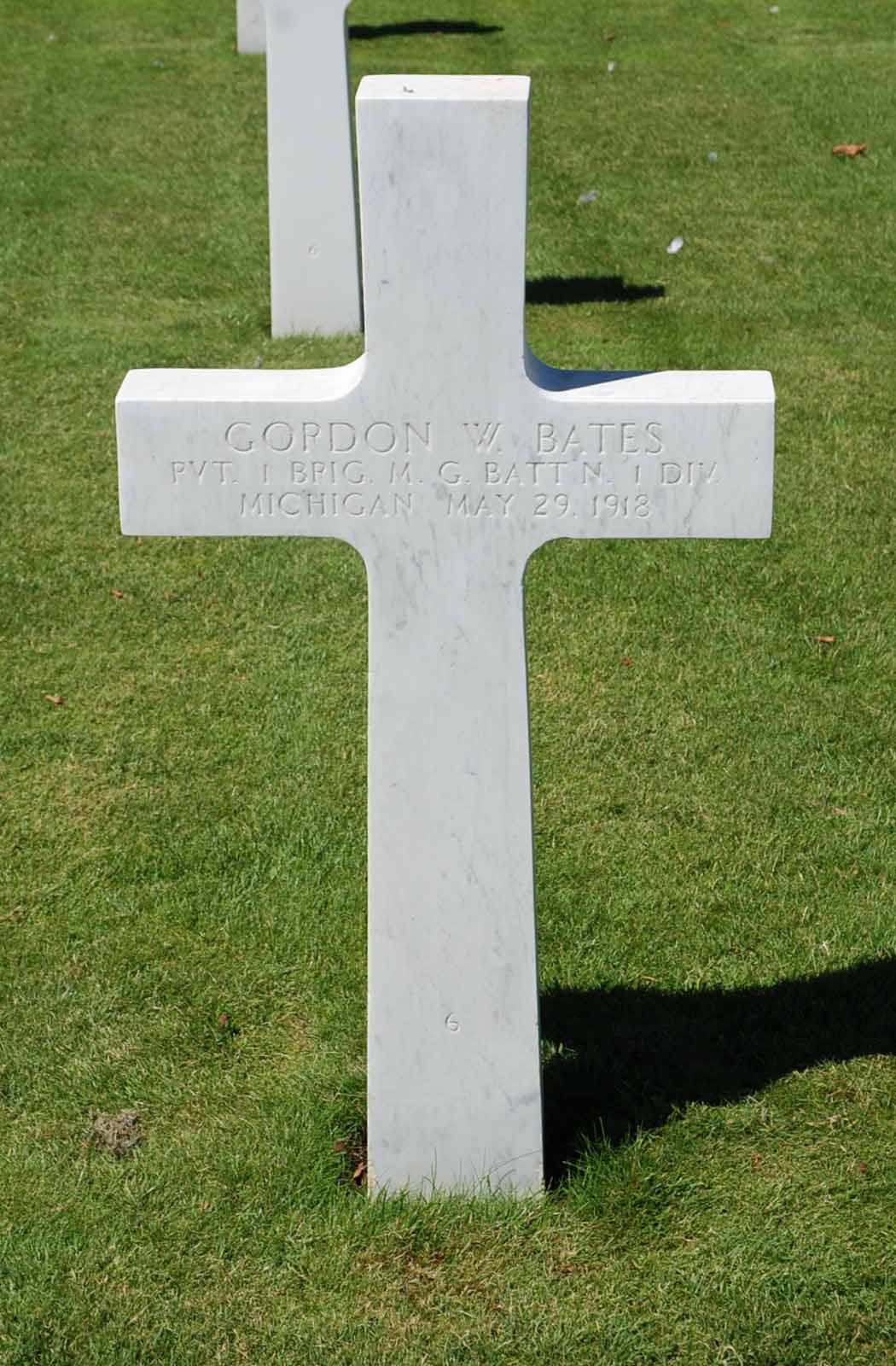 When Gordon W. Bates was born on December 31, 1894, in Michigan, his father, Adelbert, was 39 and his mother, Lula, was 18. He had nine siblings. He enlisted in the Army on September 20, 1917. He served in the U.S. Army during World War I as a Private in Company B, 2nd Machine Gun Battalion. He died of wounds on May 29, 1918 and is now buried in Somme American Cemetery, Bony, France. He also has a marker in Mount Hope Cemetery, Shelby, Oceana County, Michigan, USA.
