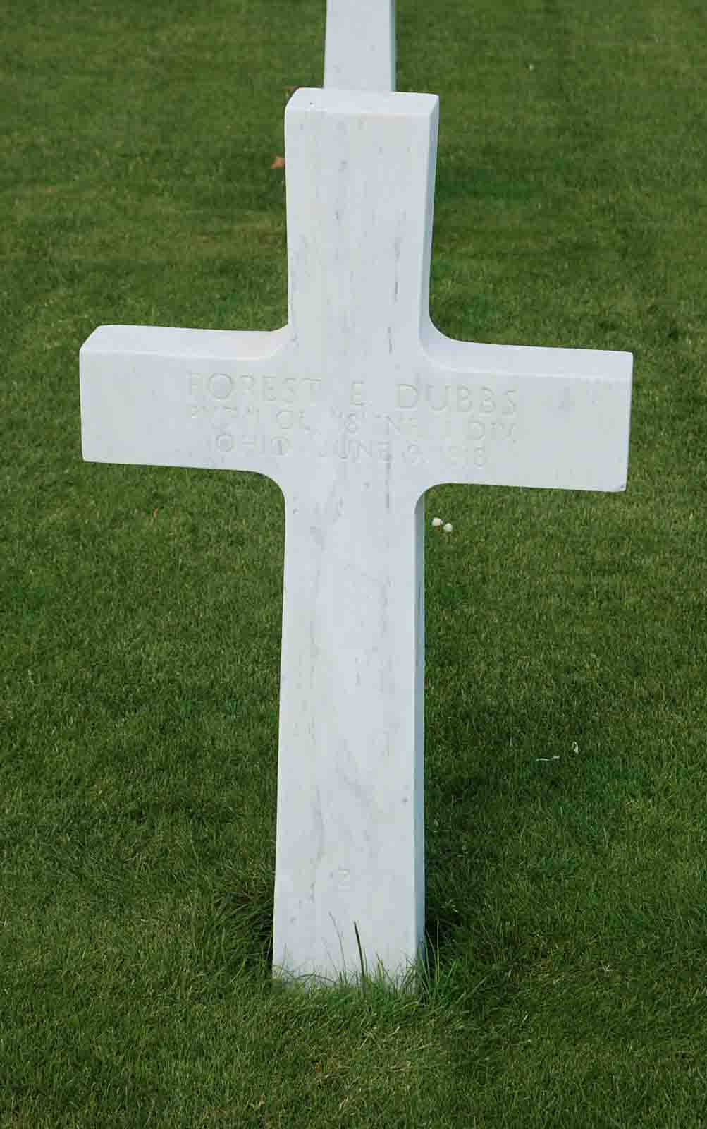 Forest E. Dubbs entered the military service in Ohio. He served in the U.S. Army during World War I as a Private First Class in Company F, 18th Infantry Regiment, 1st Infantry Division. He died on June 9, 1918 and is now buried in Somme American Cemetery, Bony, France.