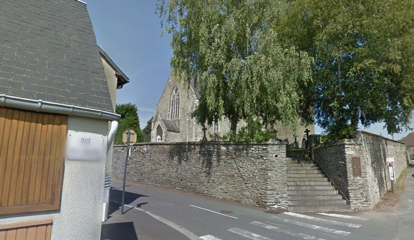 At the corner of Rue de la Cabule et Rue de l'Eglise on the outside of the wall surrounding the church.
