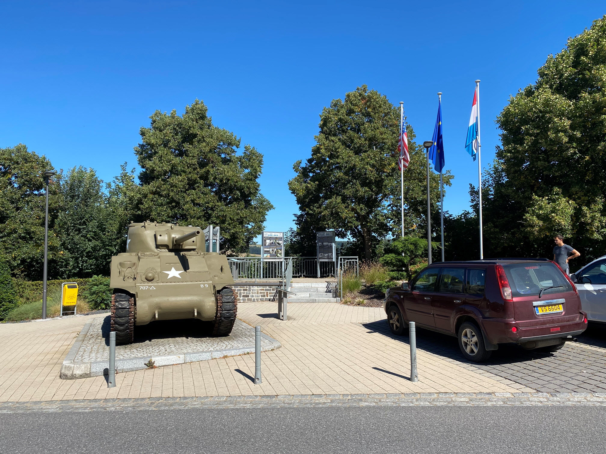 Sherman Tank of the 707th Tank Battalion, three flag poles, and three information panels.
