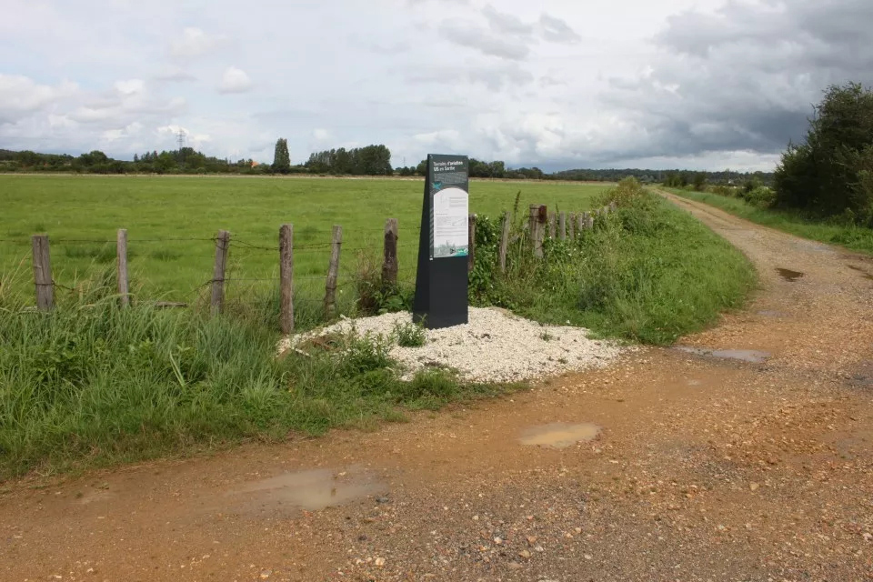 The site is the former U.S. A-49 Airfield. Take the D240 towards Boëssé le Sec, after the agglomeration exit sign take the first path on the right (in front of the sign of locality La Martinière). A small green sign indicates the direction of the stele which is 450 meters away.