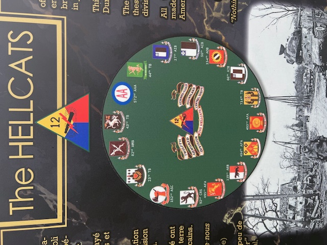 The inscription on the plaque is written in French and English. The plaque also includes photos and the unit insignias of all the 12th Armored Divsion subordinate units. The English inscription reads: