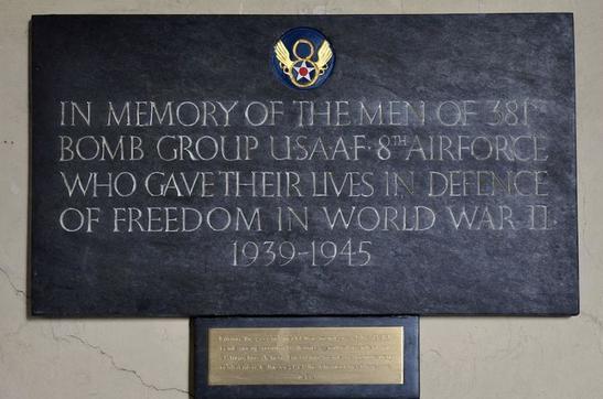 The plaque remembers the 381st Bomber Group that flew from nearby RAF Ridgewell (USAAF Station 167) during WW2.