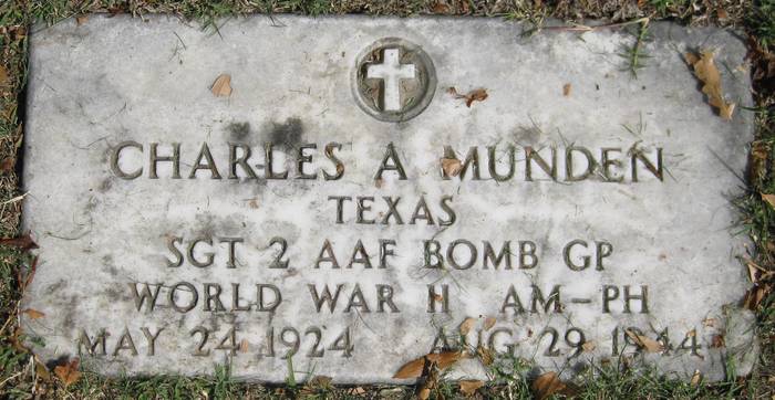 Charles A. Munden was born on May 24, 1924, in Dallas, Texas. He was the son of Harry Allen Munden Sr. and Ruby Jane McCall Munden. He attended Sunset High School for three years before enlisting in the U.S. Air Force in Dallas on May 25, 1943. He served in the 20th Bombardment Squadron, 2nd Bomber Group, Heavy, as a Sergeant and Waist Gunner of B-17 #42-31473 nicknamed 'My Baby' during World War II.