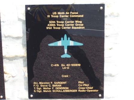 MonumentThe monument honors the crews of the IX Troop Carrier Command of the U.S. Ninth Air Force who transported American paratroopers during the D-Day airborne operations of Operation Overlord on the night of 56 June 1944, commemorating several C-47 Skytrain aircraft shot down by German anti-aircraft fire near Picauville and remembering the paratroopers and airmen who were killed. The monument consists of a stone and concrete memorial wall with several black commemorative plaques dedicated to the fallen aircrew and paratroopers. At the center of the wall are the insignia of the U.S. 82nd and 101st Airborne Divisions, Airborne Troop Carrier units, IX Troop Carrier Command, and the Ninth Air Force. Behind the wall stands a large elevated replica of a C-47 Skytrain mounted on a tall pedestal, symbolizing the transport aircraft used in the airborne assault.