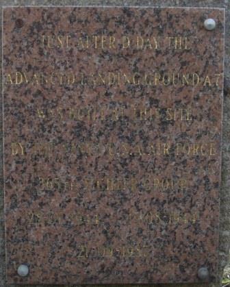 A small rough-hewn vertical stone pillar with a brown plaque with gold lettering on it commemorating the airfield and those who flew from it.