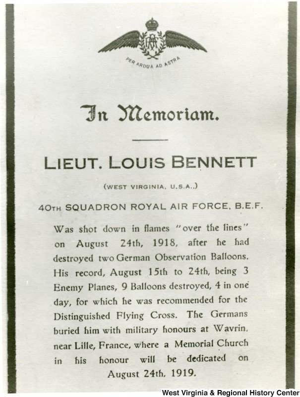 Military aviator Louis Bennett Jr. (September 22, 1894 - August 24, 1918) was West Virginia's only World War I fighter ace. Born in Weston, Bennett was the son of Louis Bennett Sr., the unsuccessful 1908 Democratic candidate for governor, and Sallie Maxwell Bennett. Bennett died in France of injuries sustained when his plane was shot down by German anti-aircraft fire. With 12 combat kills, including three aircraft and nine balloons, Bennett placed himself ninth on the World War I roster of American-born aces. This record was accomplished in just ten days after assignment to his combat unit on August 14, and with only 41 hours of combat flying time.