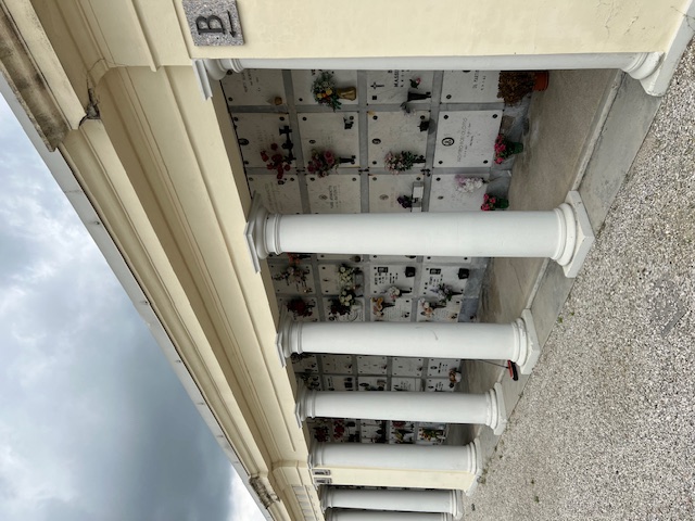 On a wall in the cemetery in Section B (left half of cemetery, back right corner)