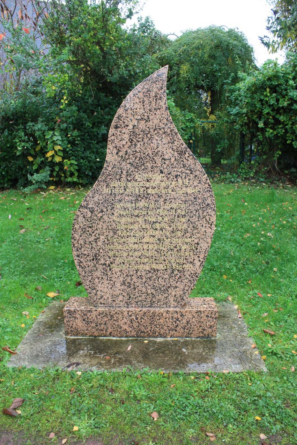 A smooth flame-shaped stele inscribed in French text with yellow lettering. It commemorates the crew of the B-24 #42-52624 Box Car of the 839th Bomber Squadron, 487th Bomber Group, Heavy, that was shot down here on June 7, 1944.
