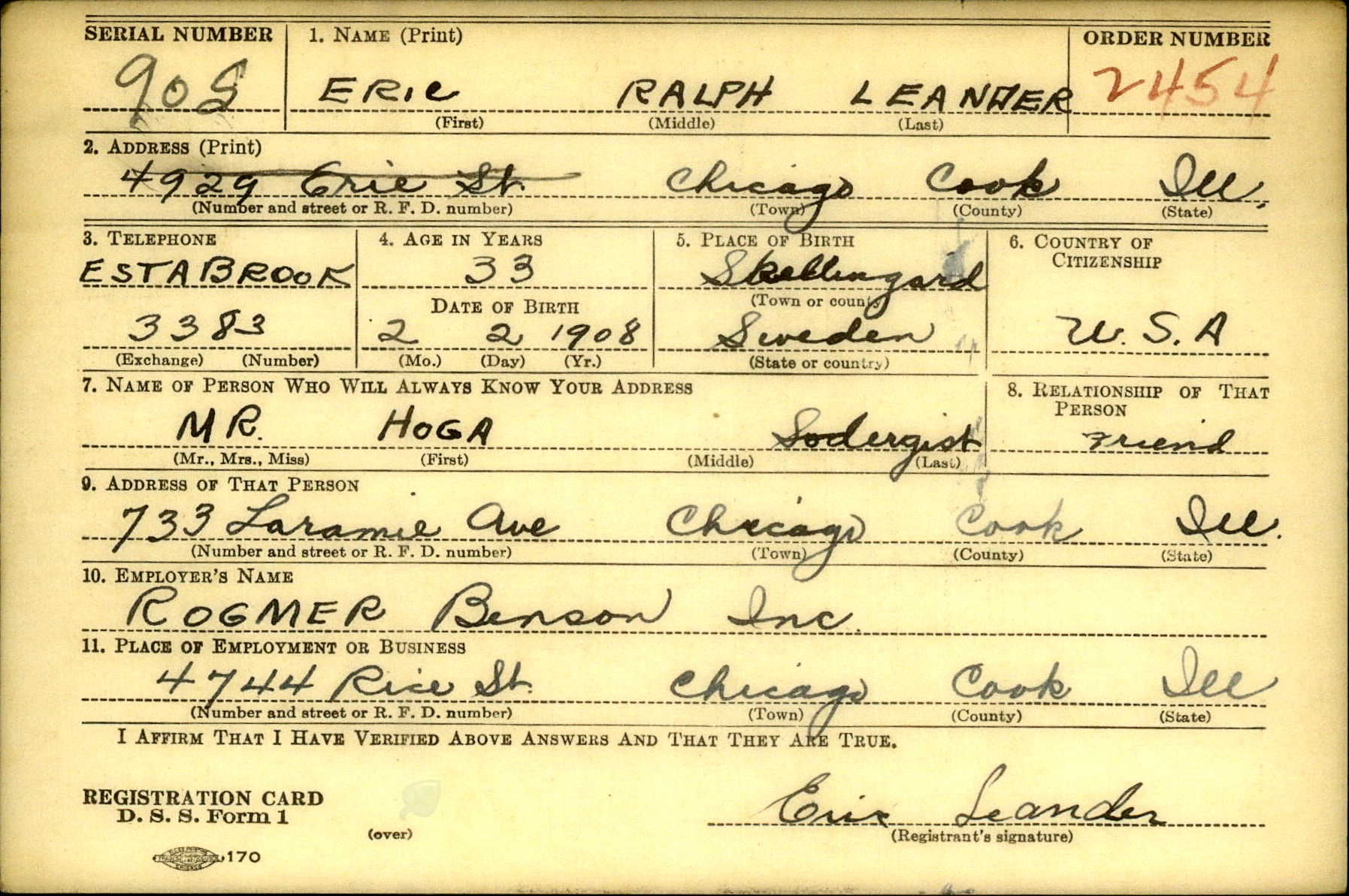 Eric Leander was born of February 2, 1908 in Tofteryds, Sweden. He immigrated to the United States in 1927 and became a citizen in 1932. He lived in Chicago, Illinois and enlisted in the US Army in 194 Service Number 36324211. After his death is was temporarily interned until his bodied was returned to his native country of Sweden in 1949. He was one of over 4,200 US soldiers born in Sweden who served in the US military from 1941-45.