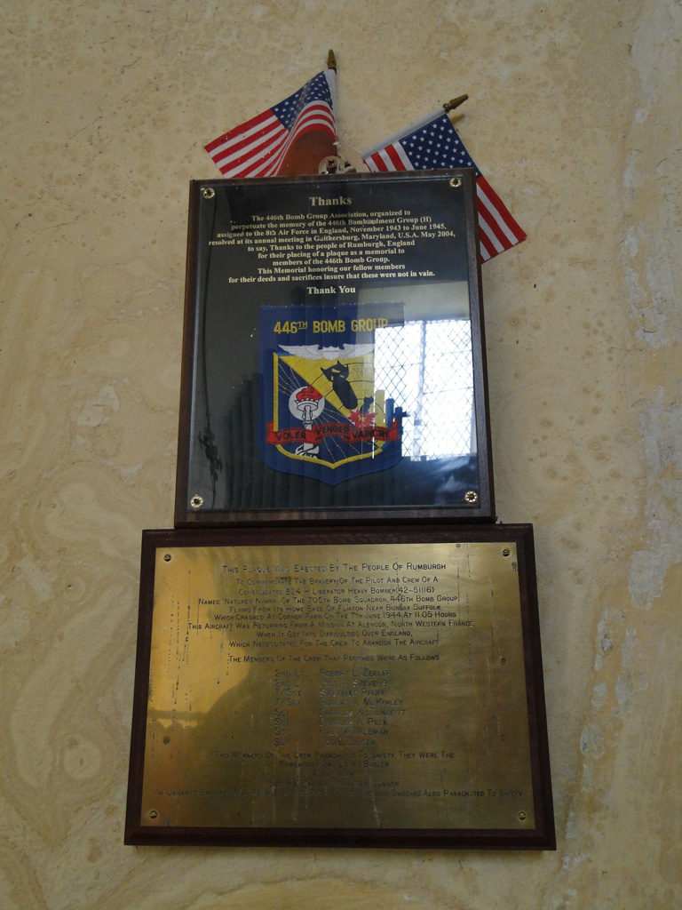 A rectangular vertically oriented plaque with dark background inscribed in English in gold lettering with the 486th Bomb Group insignia in full colors below the inscription. The plaque serves as gratitude from the 446th Bomb Group Association to the people of Rumburgh for placing a memorial plaque inside the church honoring their fellow members who died in a crash. This appreciation plaque is placed above the said commemorative plaque.