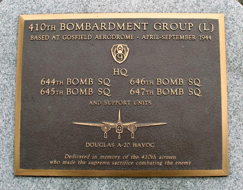 A square bronze plaque with a dark background, mounted to an irregular stone block that is mounted on a two-stepped base. The plaque is inscribed in English text in relief lettering with two relief images of the 9th Air Force insignia and front view of Douglas A-20 Havoc aircraft. The memorial commemorates the 410th Bombardment Group and support units that were based at Gosfield airfield, especially the airmen who lost their lives during World War II. The memorial was dedicated in 1991 and was cleaned/restored in 2019 by The Gosfield War Memorial Committee and local support.