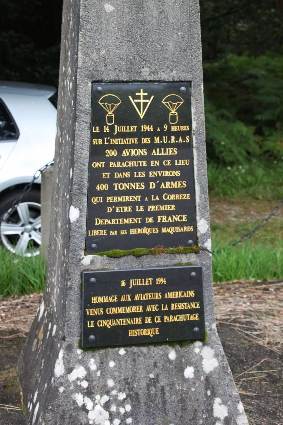 A chained off obelisk bearing two commemorative plaques, one above the other, that are inscribed in French in engraved and gold lettering. The upper plaque tells a brief description and the significance of the parachuting that was done here by the allies on July 14, 1944. The lower plaque is the commemoration of the 50th Anniversary of the parachute drop.