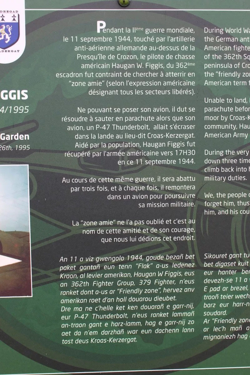 Ne pouvant se poser son avion, il dut se résoudre à sauter en parachute alors que son avion, un P-47 Thunderbolt, allait s'écraser dans la lande au lieu-dit Croas-Kerzergat. Aidé par la population, Haugan Figgis fut récupéré par l'armée américaine vers 17H30 en ce 11 septembre 1944.