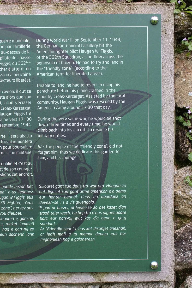 Unable to land, he had to revert to using his parachute before his plane crashed in the moor by Croas-Kerzergat. Assisted by the local community, Haugan Figgis was rescued by the American Army around 17:30 that day.