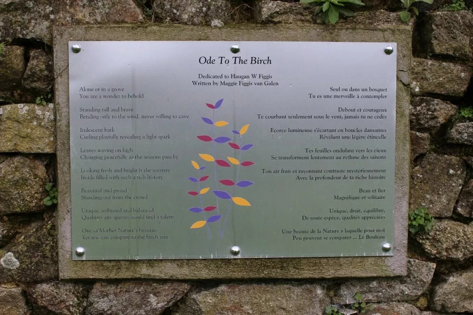 A rectangular green plaque containing the story of the crash of 2Lt Figgis in Pouldergat. The plaque is written in French, English, and Breton, in white and printed lettering. On the left side of the plaque is the photo of the aviator. In the background, is an illustration of a P-47. The plaque was inaugurated on June 9, 2018. To the right of this plaque, is an aluminum plaque entitled "Ode to Birch" written by Maggis Figgis Van Galen that is dedicated to Haugan W. Figgis.