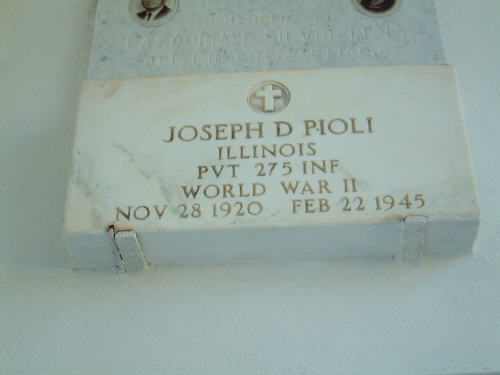 Joseph (Giuseppe) D. Pioli was born in Italy on November 28, 1920. He immigrated to the US in 1924 with his family and resided in Chicago, Illinois. He served in B Company, 1st Battalion, 275th Infantry Regiment of the 70th Infantry Division - "Trailblazers". He was killed in Action on February 22, 1945; his unit was involved in actions against the enemy near Forbach, France near the German border and the Siegfried line. He was buried in his Italian place of birth in Cerageto, Italy in 1949.