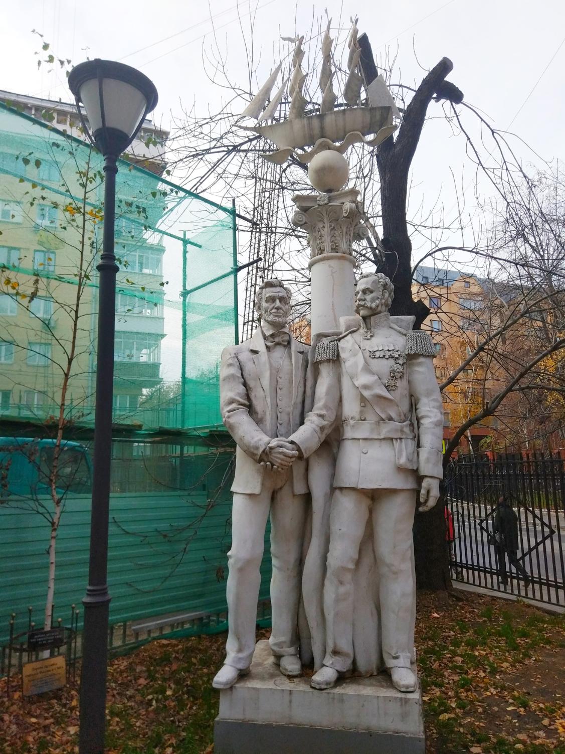 Burganov's other works include a monument to Alexander Pushkin located at George Washington University in Washington DC (2000); a statue of John Quincy Adams, the first U.S. Ambassador to Russia and later President of the United States, located in front of the U.S. Embassy in Moscow (2008); and a nearby statue of US President Abraham Lincoln shaking hands with Russian Tsar Aleksandr II (2011). Although President Lincoln and Tsar Aleksandr II never met in person, they did correspond -- and both led their countries during challenging reform periods: Aleksandr II abolished serfdom in Russia in 1961, Lincoln issued the Emancipation Proclamation in the U.S. in 1963, and both fell to assassins.