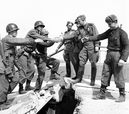 However, the sculpture is a stylized version of staged photos taken by International News war correspondent Allan Jackson on 26 April 1945, the day following the actual link-up: Included in the photos below show U.S. 69th Division soldiers who were in Torgau preparing for the formal meeting between Division Commander Major General Emil Reinhardt and the Soviet 58th Guards Division Commander General-Maj Vladimir Rusakov.
