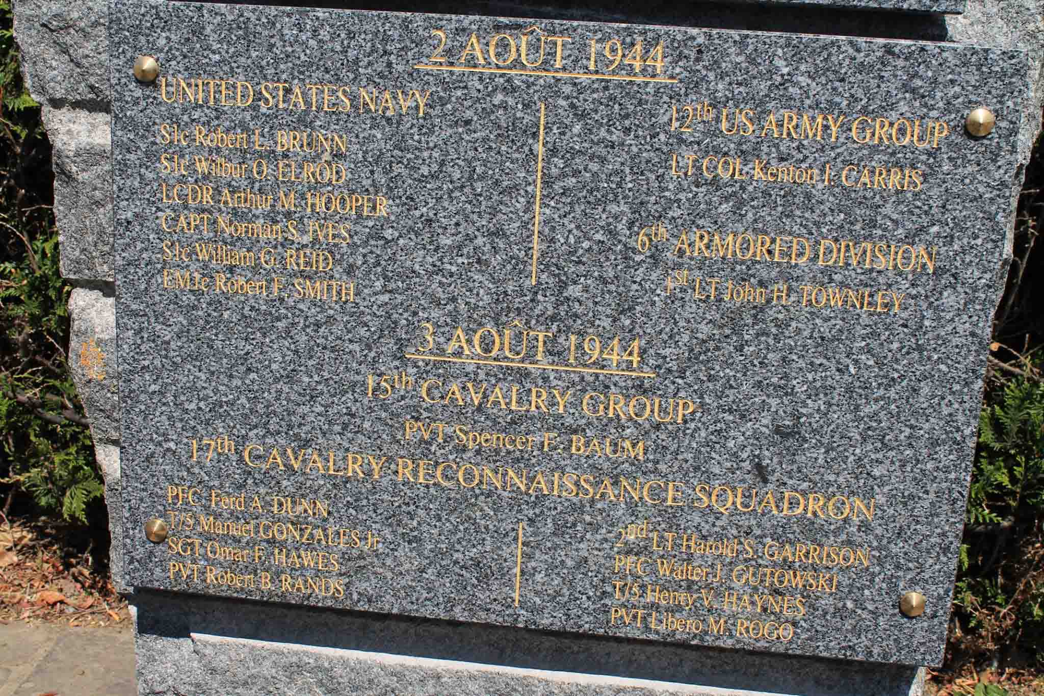 A monument bearing two gray plaques that are written in French in gold lettering. The upper plaque commemorates American soldiers and sailors who died during the liberation for Dol-De-Bretagne. The lower plaque contains the list of the casualties in the ambush. The monument was inaugurated in 1980 and was modified in 2014.