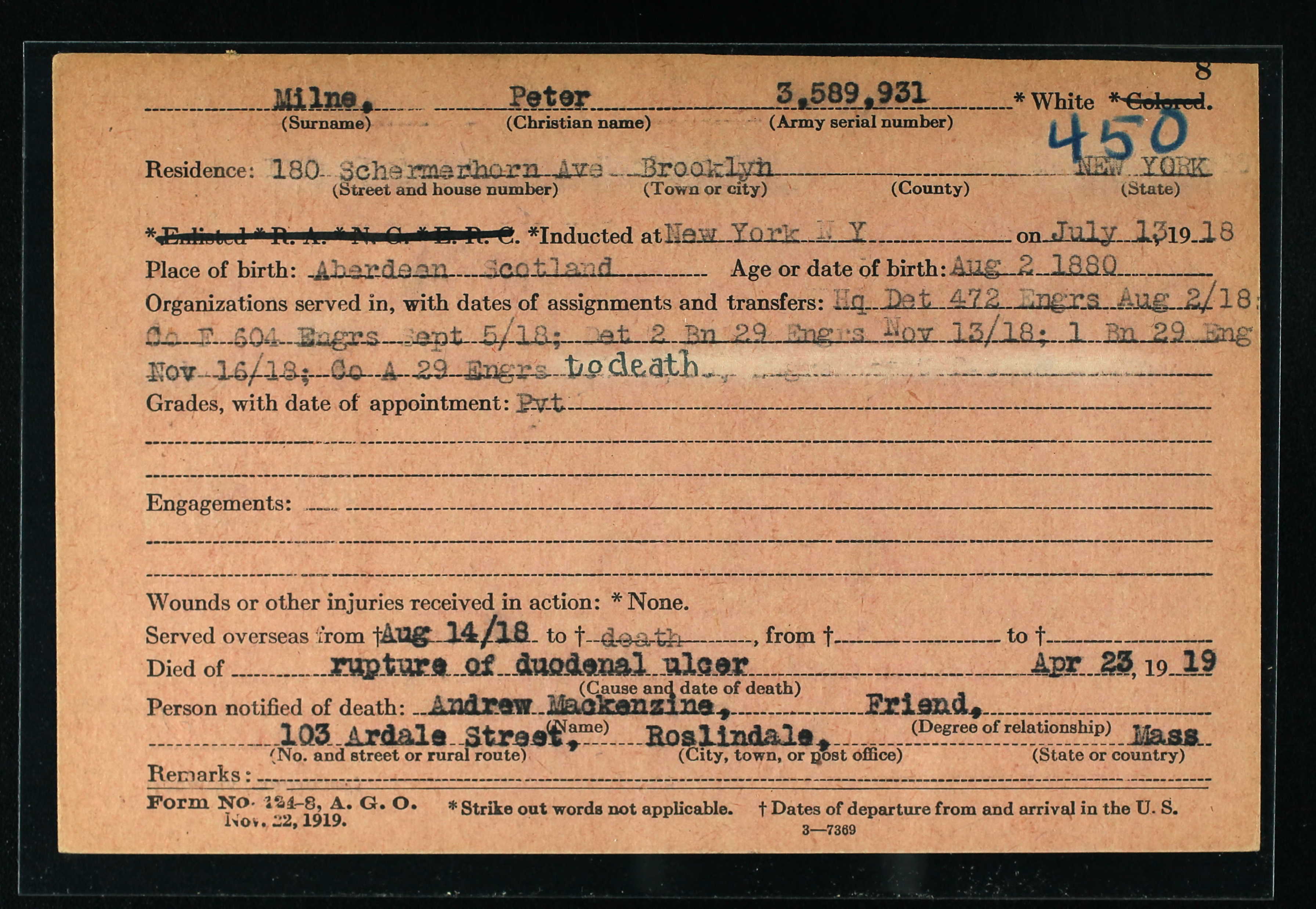 Private Peter Milne was born in Aberdeen, Scotland in either 1877 or 1880. He immigrated to the US and lived in New York. As he trained as a lithographer, he enlisted in the US Army with the Engineers. He served in the Company F of the 604th Engineers and was then transferred to the 29th Engineers in November 1918. The 29th Engineers were known as the "Wayfinders" was a topographic survey unit. They were located in Koblenz, Germany as part of the Occupation force when Private Milne died in April 1919. He is buried in his family plot in his hometown in Scotland.