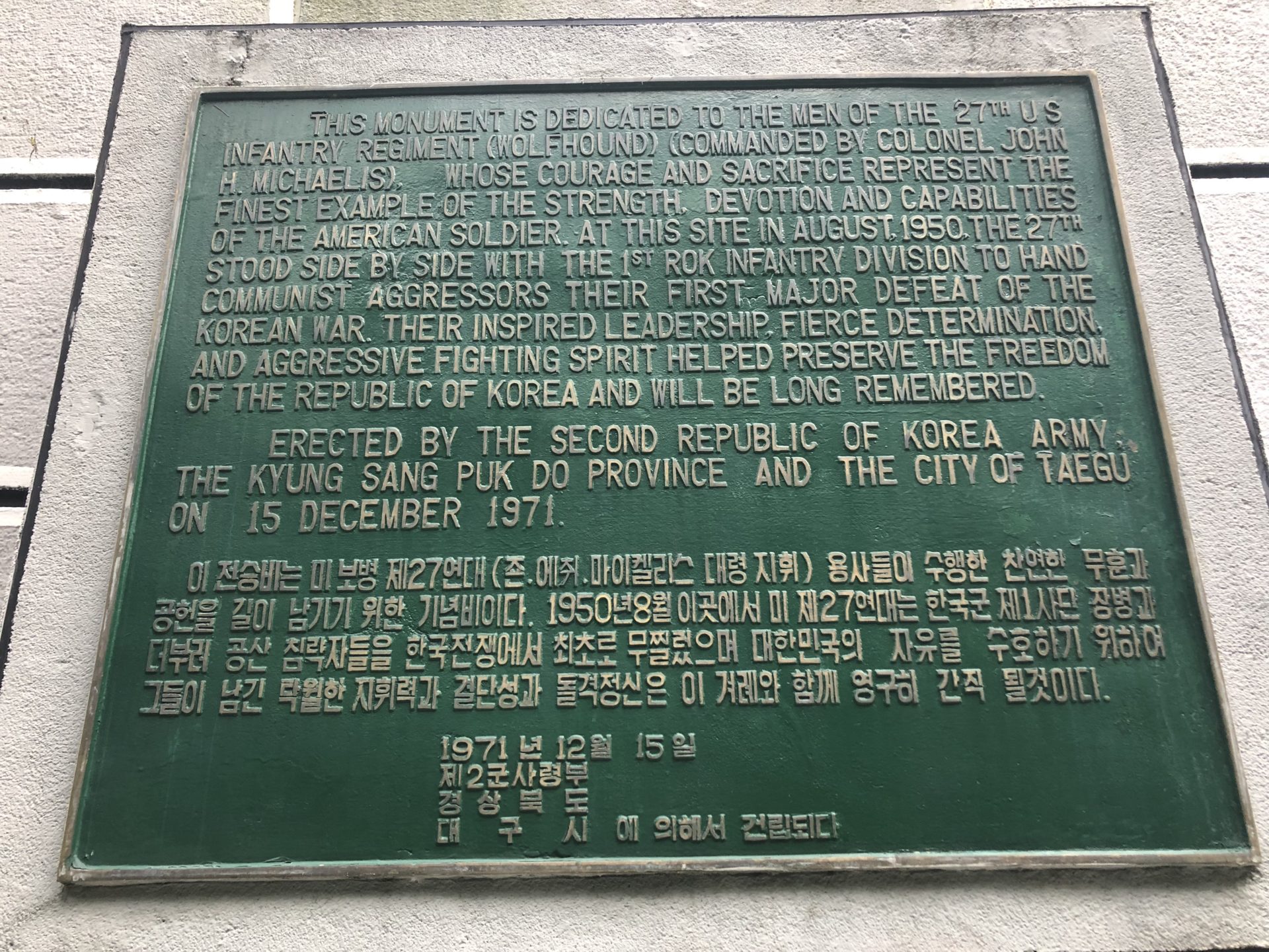 THIS MONUMENT IS DEDICATED TO THE MEN OF THE 27th US INFANTRY REGIMENT (WOLFHOUND) (COMMANDED BY COLONEL JOHN H. MICHAELIS) WHOSE COURAGE AND SACRIFICE REPRESENT THE FINEST EXAMPLE OF THE STRENGTH. DEVOTION AND CAPABILITIES OF THE AMERICAN SOLDIER, AT THIS SITE IN AUGUST 1950,THE 27th STOOD SIDE BY THE SIDE 1st ROK INFANTRY DIVISION TO STOP AND GIVE COMMUNIST AGGRESSORS THEIR FIRST MAJOR DEFEAT OF THE KOREAN WAR. THEIR INSPIRED LEADERSHIP, FIERCE DETERMINATION. AND AGGRESSIVE FIGHTING SPIRIT HELPED PRESERVE THE FREEDOM OF THE REPUBLIC OF KOREA AND WILL BE LONG REMEMBERED.