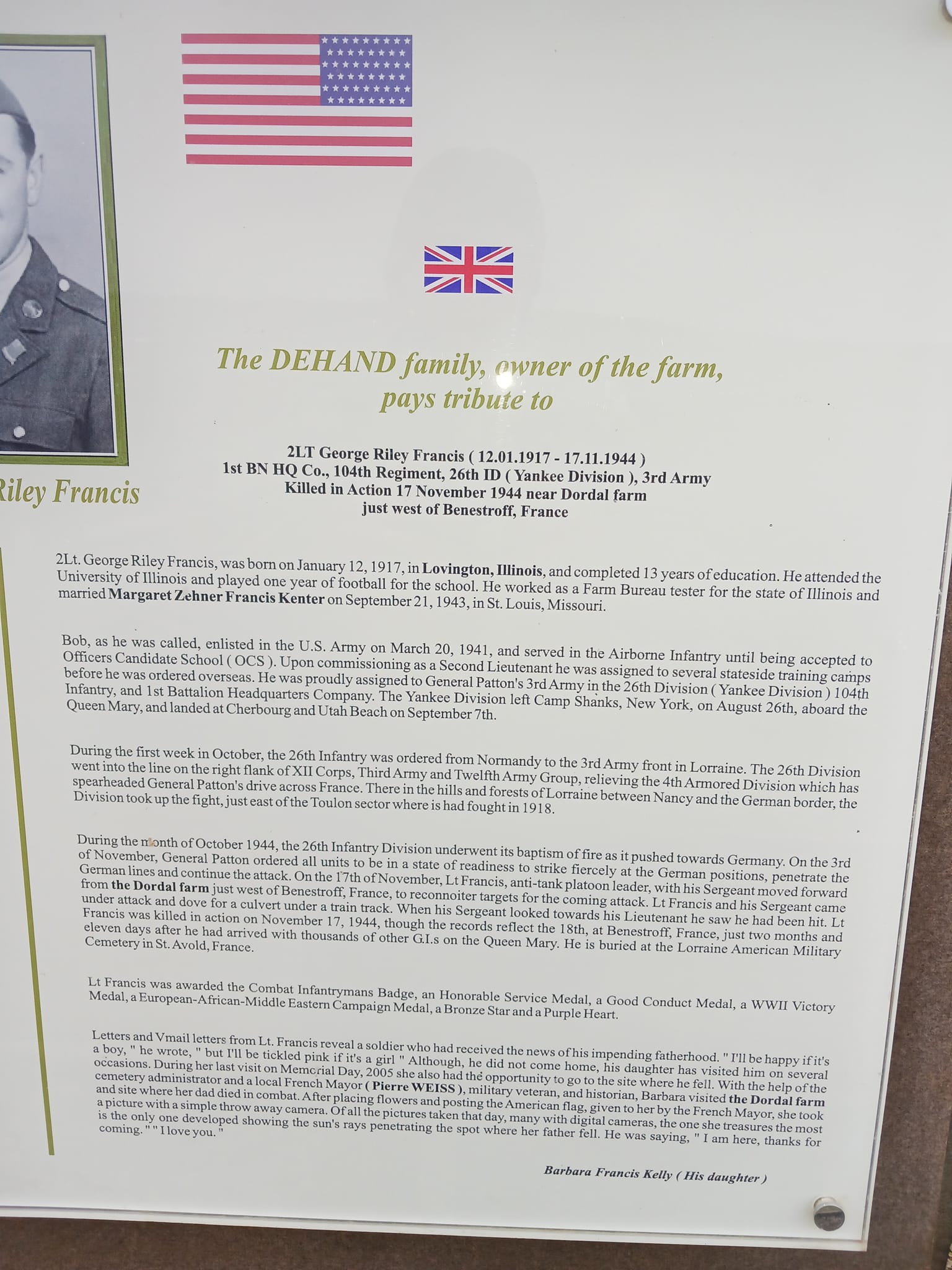 Letters and Vmail letters from Lt. Francis reveal a soldier who had received the news of his impending fatherhood. " I'll be happy if it's a boy, " he wrote, " but I'll be tickled pink if it's a girl " Although, he did not come home, his daughter has visited him on several occassions. During her last visit on Memorial Day, 2005 she also had the opportunity to go to the site where he fell. With the help of the cemetery administrator and a local French Mayor ( Pierre WEISS), military veteran, and historian, Barbara visited the Dordal farm and site where her dad died in combat. After placing flowers and posting the American flag, given to her by the French Mayor, she took a picture with a simple throw away camera. Of all the pictures taken that day, many with digital cameras, the one she treasures the most is the only one developed showing the sun's rays penetrating the spot where her father fell. He was saying, " I am here, thanks for coming." " I love you."