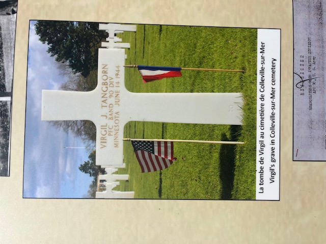 A rectangular information board mounted on a wooden base honoring PFC Virgil J. Tangborn, highlighting his personal background and military service up to his death. The board, presented in both English and French, features his photograph, the citation for the award he received posthumously, an image of his gravestone and the ‘’4 Braves’’ statues, and the insignias of the units he served with during World War II.