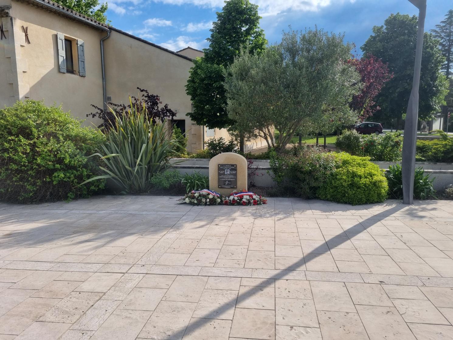 An upright stone slab monument bearing a rectangular black plaque in the center commemorating 2Lt Donald E. Burns, who died in the area on August 19, 1944. The plaque, inscribed in French and bearing his photograph, was inaugurated on May 8, 2025.