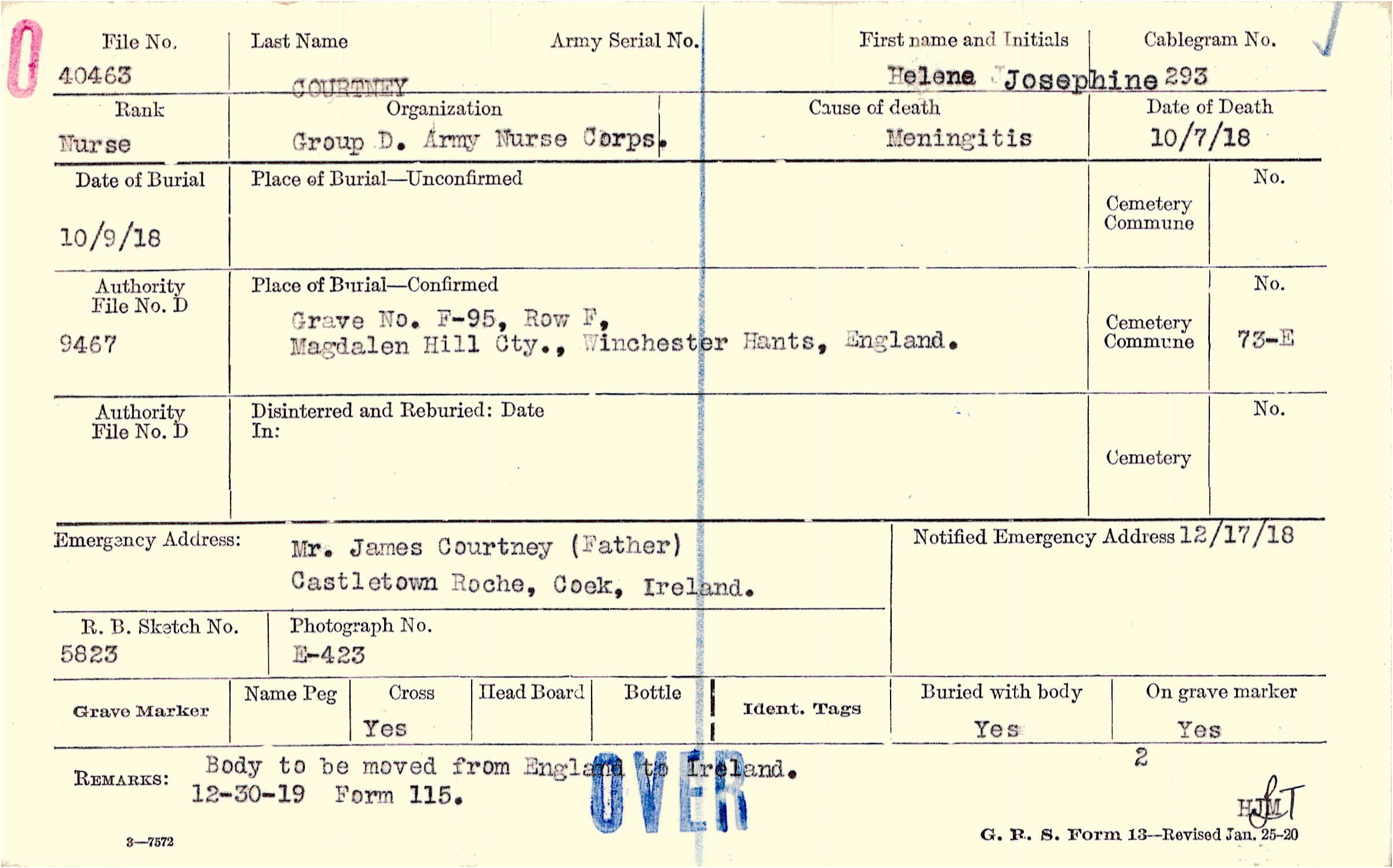 The Isolated burial of an Irish-American who died while serving with the Red Cross and US Army in England in World War 1. Nurse Helen Josephine 'Helena' Courtney was born in County Cork Ireland in 1888 (or possible 1892). She immigrated to the US and became a nurse training Springfield, Ohio. She joined the US Army (or possibly the Red Cross initially) in was transferred to England in early 1918. She served at Base Hospital 33 in Portsmouth, England. Base Hospital 33 tended to over 3500 patients during the war. Nurse Courtney died of meningitis on October 7, 1918. She was buried in England and was transferred to Ireland in 1920 and was buried in the family plot.