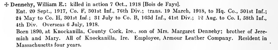 The isolated Burial (ISOB) of Private Thomas Edward Dennehy of Company I, 58th Infantry Regiment., 4th Infantry 'Ivy' Division. Private Dennehy immigrated to the US and lived in Massachusetts. He joined the US Army and was killed in action on October 7, 1918 during the Meuse-Argonne Offensive in World War 1. His remains were returned to Ireland in 1922 on the SS Millwater and he was buried Drishane Cemetery, Millstreet, Ireland.