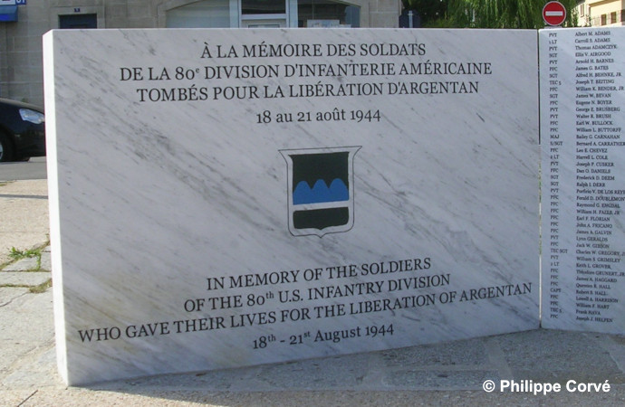 A rectangular stone monument shaped like an open book honoring the soldiers of the 80th Infantry Division and its support units who gave their lives during the liberation of the town from August 18 to 21, 1944. The right side of the monument displays the names, ranks, units, and ages of the 129 fallen soldiers. Unveiled in August 2016, it features the division’s insignia and is inscribed in both English and French.