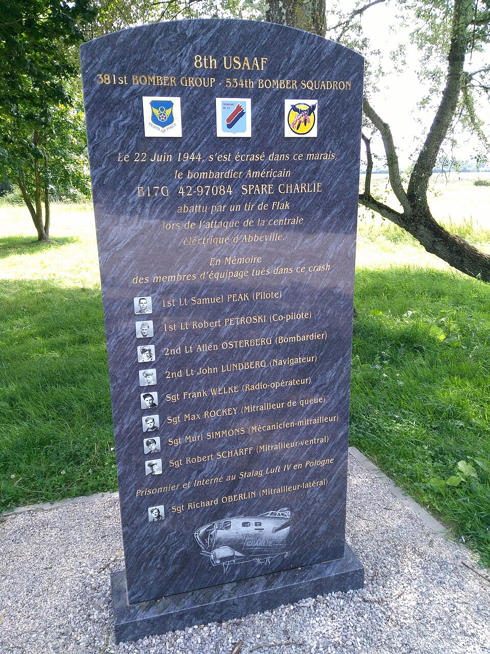 Translation: On June 22, 1944, the American bomber # 42-97084 SPARE CHARLIE crashed into this marsh, shot down by a Flak during the attack on the Abbeville power plant.