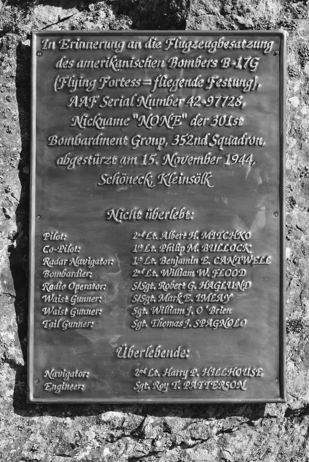 In Erinnerung an die Flugseugbesatzung, des amerikanischen Bombers B 17G (Flying Fortess= fliegende Festung), AAF Serial Number 42-97728, Nickuame "NONE" der 301st Bambardment Group, 352nd Squadron, abgestürzt am 15. November 1944,
