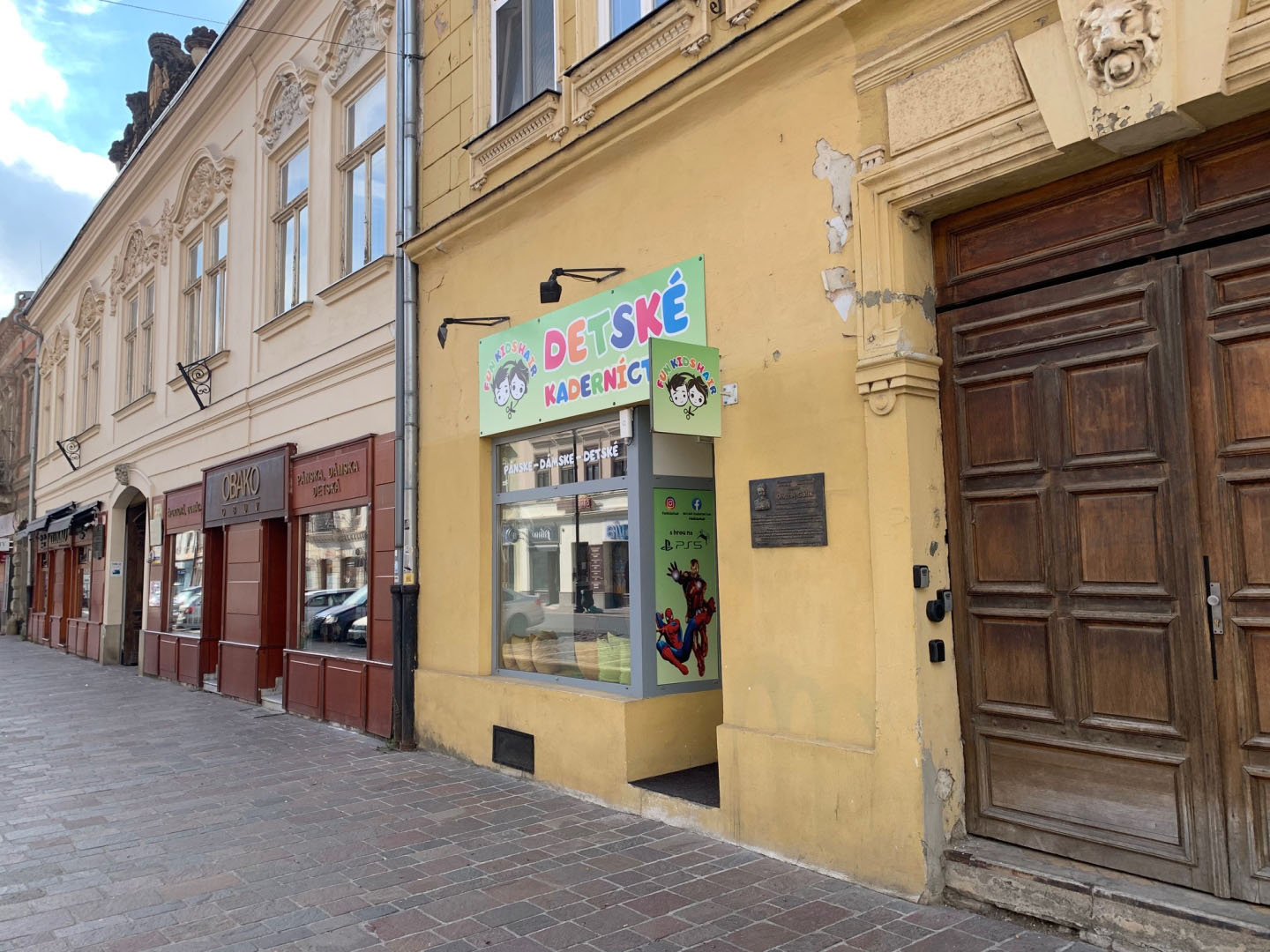 Mounted on the right-side wall, next to the entrance of the commercial store.