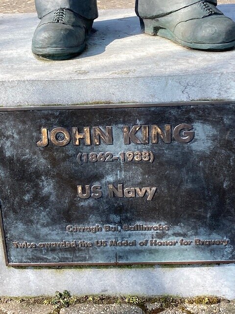 MonumentA life-sized bronze statue of John King, sculpted by local artist Rick Lewis, portrays him wearing one of his Medals of Honor while holding the second in his hand, a tribute to his exceptional courage as one of only nineteen men in U.S. history to receive the decoration twice. Of the nineteen recipients, five were born in Ireland, while three others were of Irish-American descent. The statue stands on a square stone pedestal bearing a bronze plaque inscribed with his name and a commemorative dedication. It was erected in 2013 after a multi-year community fundraising effort, led in large part by a resident who had known King in childhood and once scrambled for the coins he would toss to local children. The three-ton base, reinforced with rebar extending to the statue's midsection, ensures the monument's permanence and security. Today, the statue remains a lasting tribute in Ballinrobe, frequently featured in local Memorial Day commemorations, such as those shared by the Maggie McGuinness Pub.