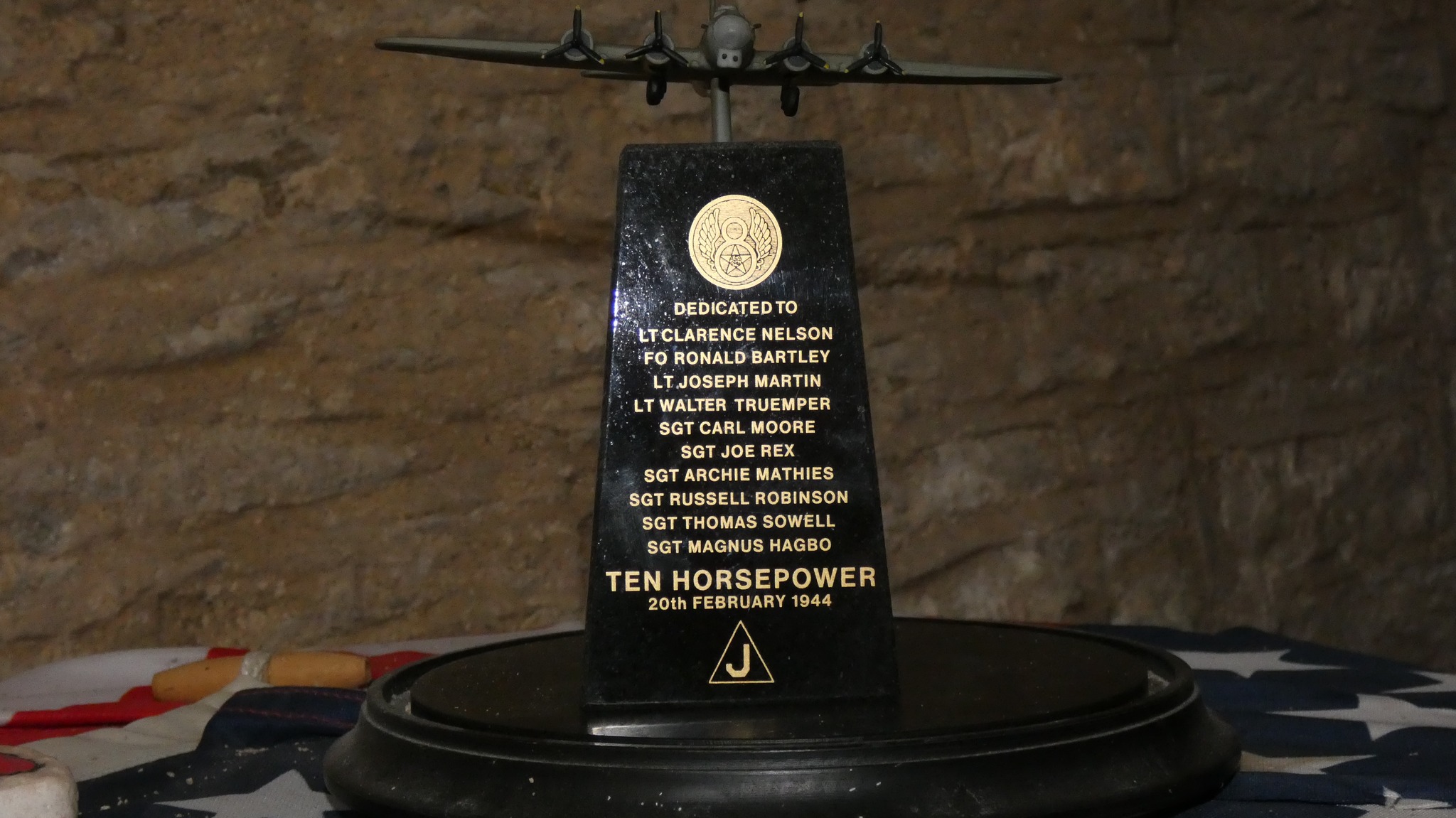 The items remember the B-17 B-17 'Ten Horsepower' #42-31763 of the 510th Bomber Squardron, 351st Bomber Group which crashed at the nearby Polebrook Airfield (USAAF 110) on February 20, 1944; two members of the crew were awarded the Medal of Honor for their actions on that day.