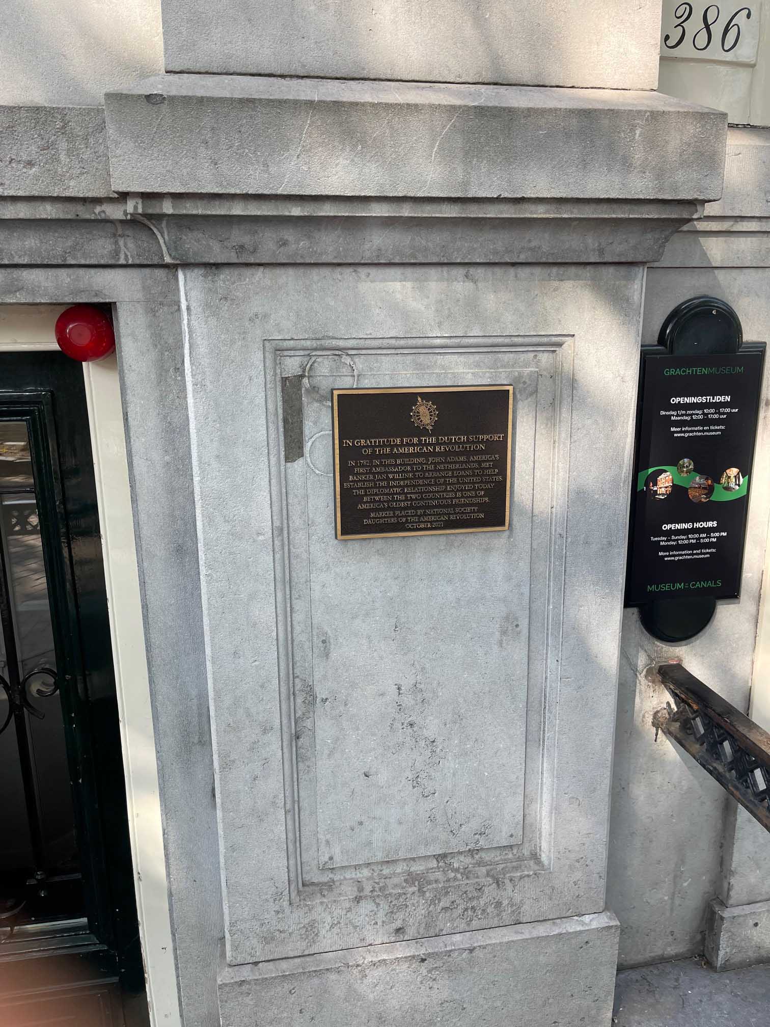 PlaqueA rectangular bronze plaque, installed in October 2001 by the National Society Daughters of the American Revolution (NSDAR), commemorating the Dutch financial support that aided the United States during the Revolutionary War.